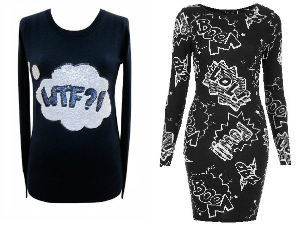 Популярные принты из пайеток Markus Lupfer не теряют позиций у любительниц ярких вещей, ценящих здоровое чувства юмора и самоиронию. Заменить такой свитер британский бренд Topshop предлагает целым платьем с длинным рукавом с уже знаковым “мультяшным” принтом.