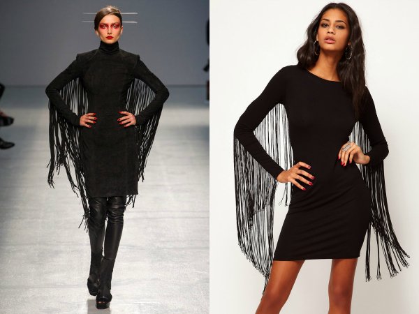 Платье из весенне-летней коллекции Gareth Pugh из замши с бахромой вдоль рукавов практически один в один скромно скопировал лидер мировых онлайн-продаж Asos. Именно за умение делать мир стильнее и прекрасней за вполне доступные деньги Asos так любят модницы во всем мире.