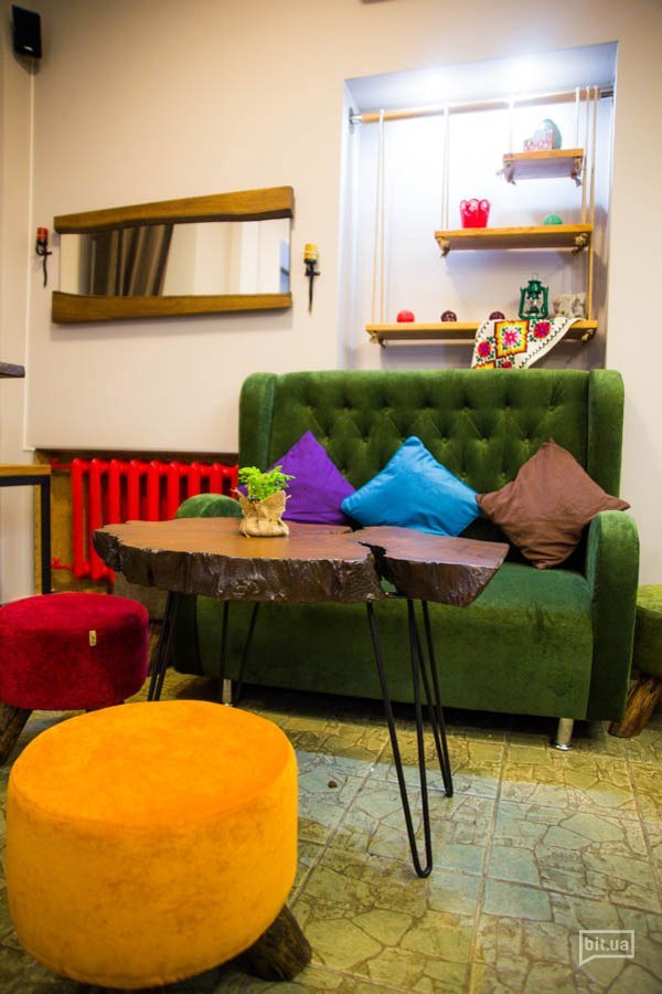 Интерьер “Кіфлик” – теплая гостиная дома у друга, дело рук и фантазии Лены и Тани. Мебель – от запорожского дизайнера Ивана Чудова, посуда – из легкой и тонкой гаварецкой керамики черного цвета.