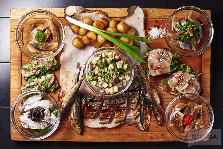А самый широкий спектр вкусов предоставляет сет сельди: сельдь в горчичном, икорном, имбирном соусе, соусе нори, севиче и паштет из сельди, карпаччо из скумбрии, копченые скумбрия и салака, а на гарнир — мягкий запеченный картофель.