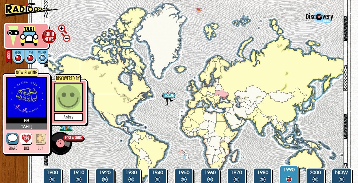 Онлайн-плеер Radiooooo предлагает совершить музыкальное путешествие в пространстве и времени. Он позволяет выбрать любую страну на карте мира, а также желаемое десятилетие в промежутке от 1900 до 2016 года. Кроме того, треки можно подобрать под настроение – что-то быстрое, медленное или же необычное.