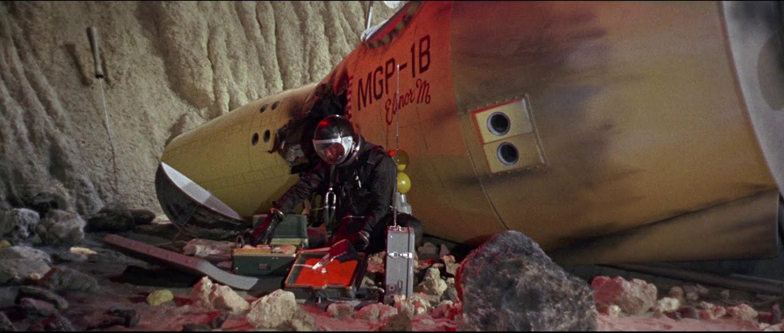 Олдскульная научная фантастика, которая с первых же минут (особенно при виде обезьянки в скафандре на борту космического корабля) покоряет своей наивностью и цветопередачей. Теплый, ламповый «Техниколор». Сюжет в точности воспроизводит название фильма. Это действительно история выживания Робинзона, знакомая нам с детства, только главный герой (его зовут Кристофер Дрейпер) приземляется на Красной планете. Там же он и встречает обезьянку Мону, своего первого друга, учится добывать кислород, находит воду и съедобное растение под поверхностью Марса. А Пятницу Дрейпер немного позже обнаружит в рядах инопланетян-рабовладельцев, которые временами прибывают на Марс.