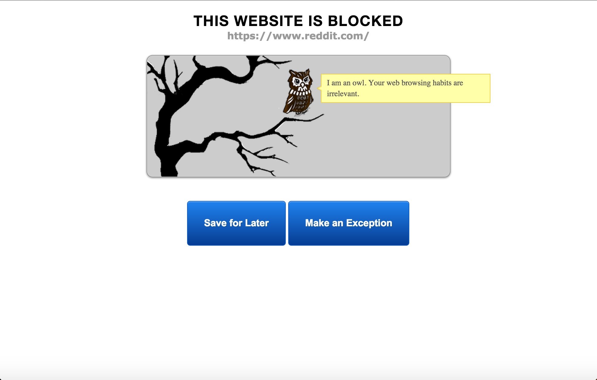 Еще одно расширение для Chrome, которое контролирует время, проведенное в интернете. Productivity Owl вначале испугает следующим приветствием: «Привет, я сова продуктивности. Я дам тебе несколько секунд, чтобы посетить веб-сайт, а затем закрою вкладку». А затем потребует некоторых усилий, чтобы полностью настроить под себя посещение тех или иных сайтов. Можно, например, выбрать специальные дни или часы, когда сова не будет запрещать интернет-серфинг. Самое интересное заключается во вкладке «заслужи уважение», где та самая скептическая сова, анализируя действия пользователя, комментирует его попытки бороться с прокрастинацией.