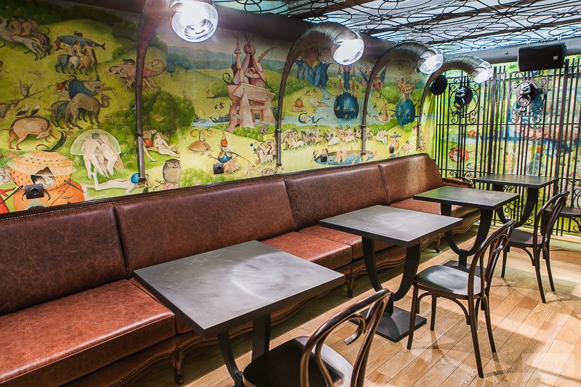 Дизайн бара – это компиляция всех элементов картины Босха “Сад земных наслаждений”, расчлененной на эпизоды “Рай”, “Сад” и “Ад”, чтобы органично вписаться в физические размеры пространства. Дизайн разрабатывала студия Mad Cat во главе с Александром Браженским и Надеждой Беленко.