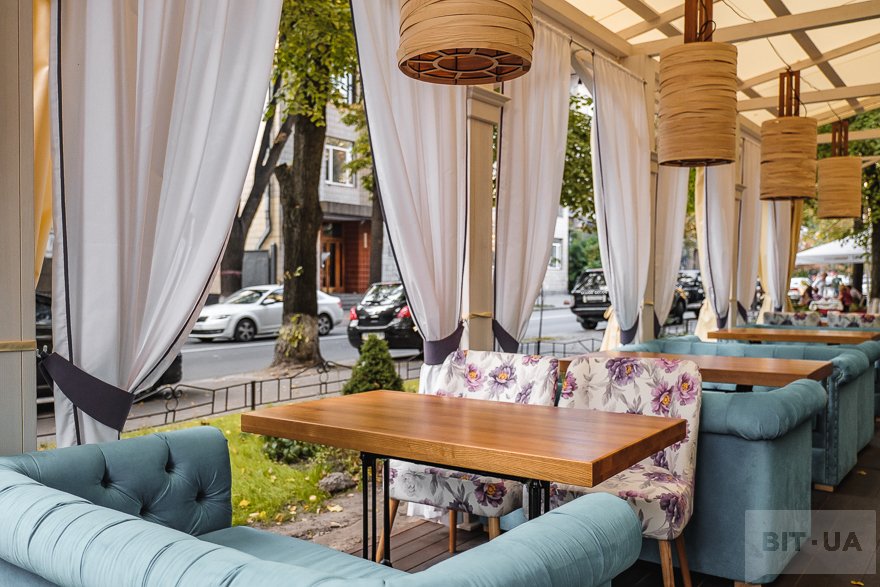 Дизайн ресторана разработала студия ARTUA design studio (главный дизайнер — Олег Украинский). Для оформления интерьера использовались мягкие текстуры, натуральные материалы и сочные цвета (бирюзовый, лиловый, ягодный). Дерево использовано для декора стен, также из него сделаны дизайнерские люстры — материал делает их свет мягче и теплее.
