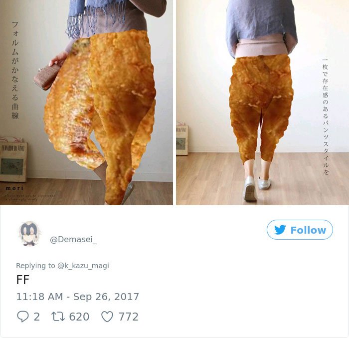 Twitter-пользователь k_kazu_magi обнаружил на сайте японского онлайн-магазина Rakuten женские штаны в виде жареных куриных ножек.