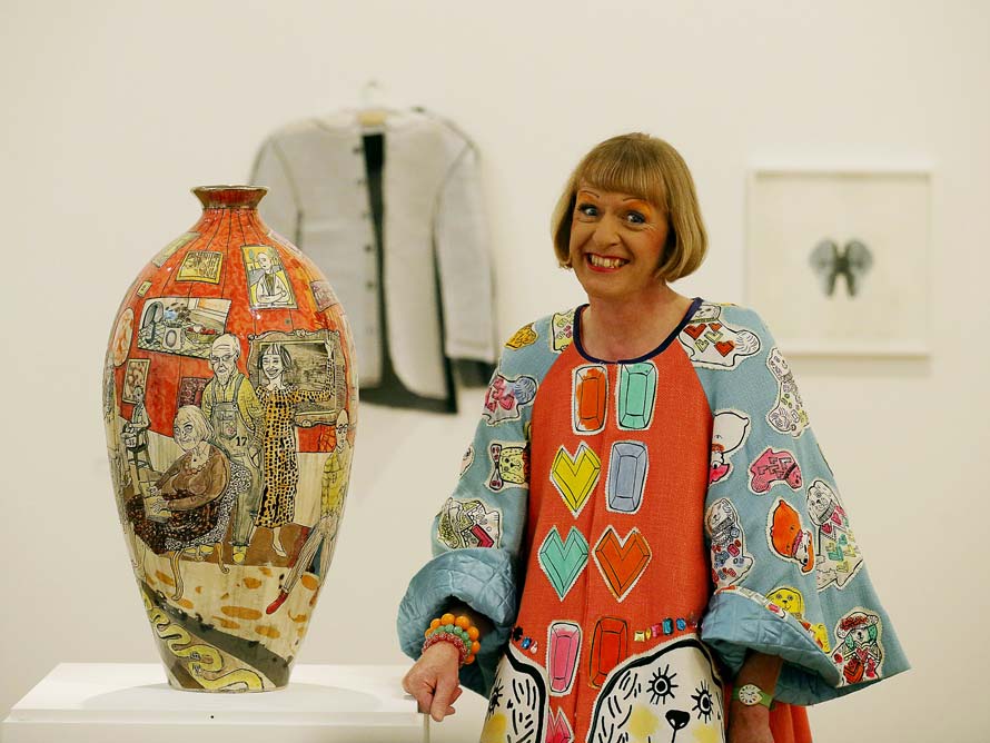 Этот художник прославился благодаря своему альтер-эго по имени Клэр: раньше Перри любил появляться на публике в цветастых платья и с плотным слоем мейкапа. В подобном виде Перри получал премию Тернера, которую выиграл за свои керамические вазы с остро социальными сюжетами из жизни британского общества. Кстати, в начале 2017-го работы этого художника можно было увидеть и в Киеве – в пространстве фонда “ИЗОЛЯЦИЯ” проходила выставка гобеленов Грейсона Перри.