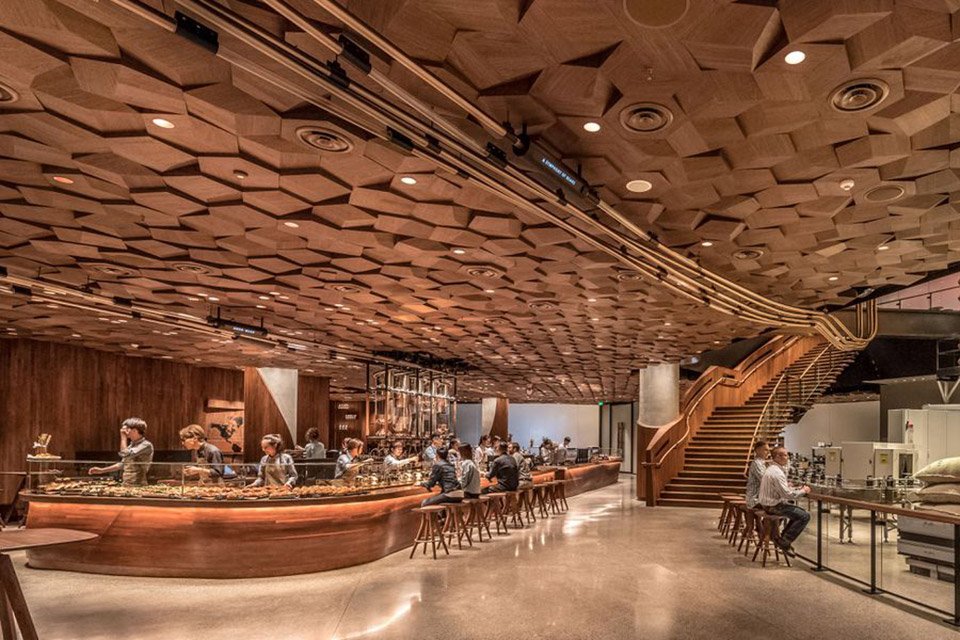 Также вы можете взглянуть на три стойки, одна из которых длинной 88 футов (26 метров), что делает ее самым длинным кофейным баром Starbucks в мире. Потолок выполнен из 10 000 деревянных гексагональных деревянных форм ручной работы, и есть 3D-печатный чайный бар, потому что – ну почему бы и нет?