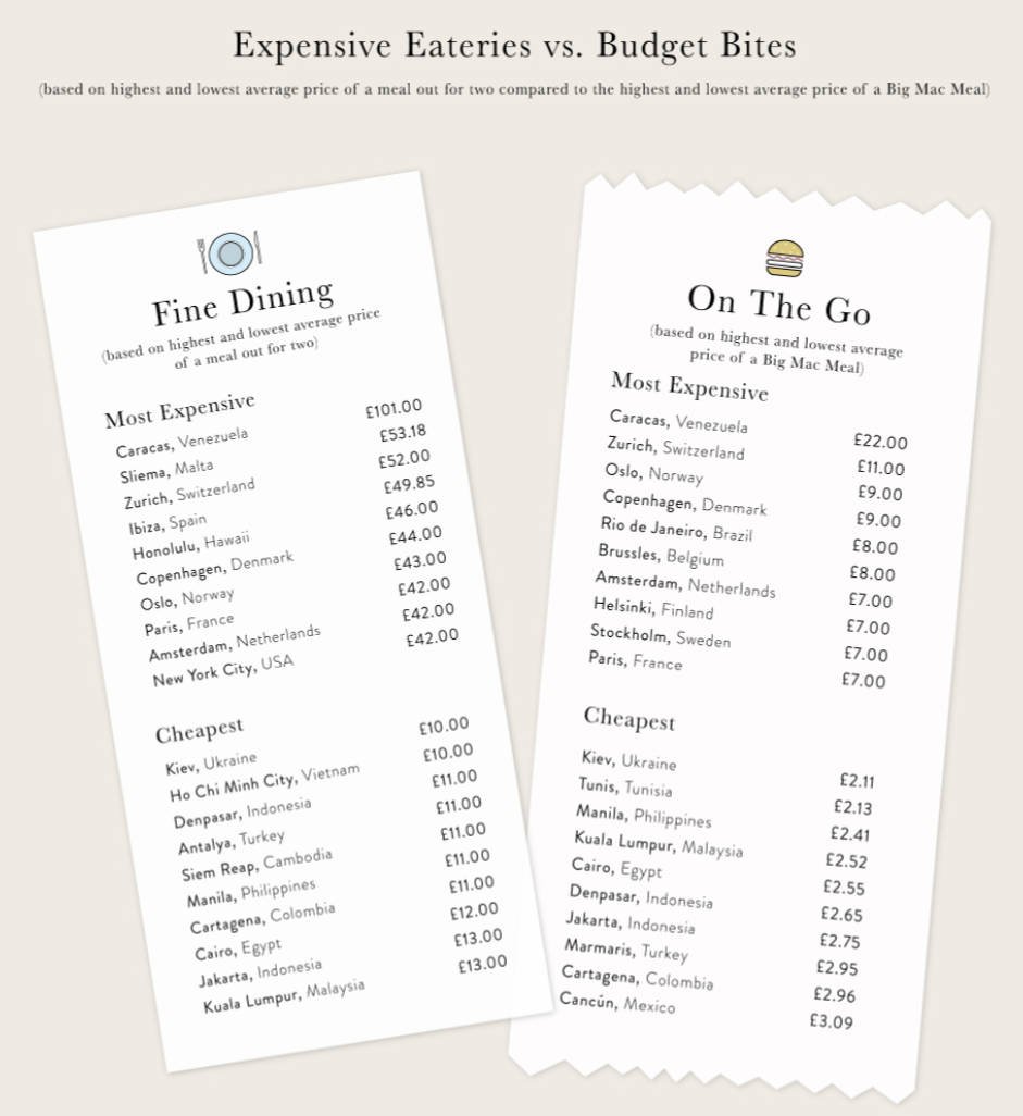 Дороже всего в столице кризисной Венесуэлы — за ужин в ресторане придется выложить 101 фунт. Однако, возможно, перекос вызван гиперинфляцией и разницей официального и черного курса боливара.