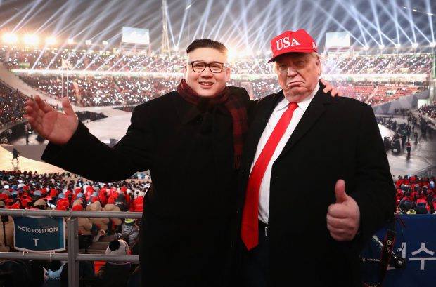 “Люди, одетые как президент США Дональд Трамп и северокорейский лидер Ким Чен Ын, присутствуют на церемонии открытия зимних Олимпийских игр в Пхенчане”, — отметило агентство Reuters.