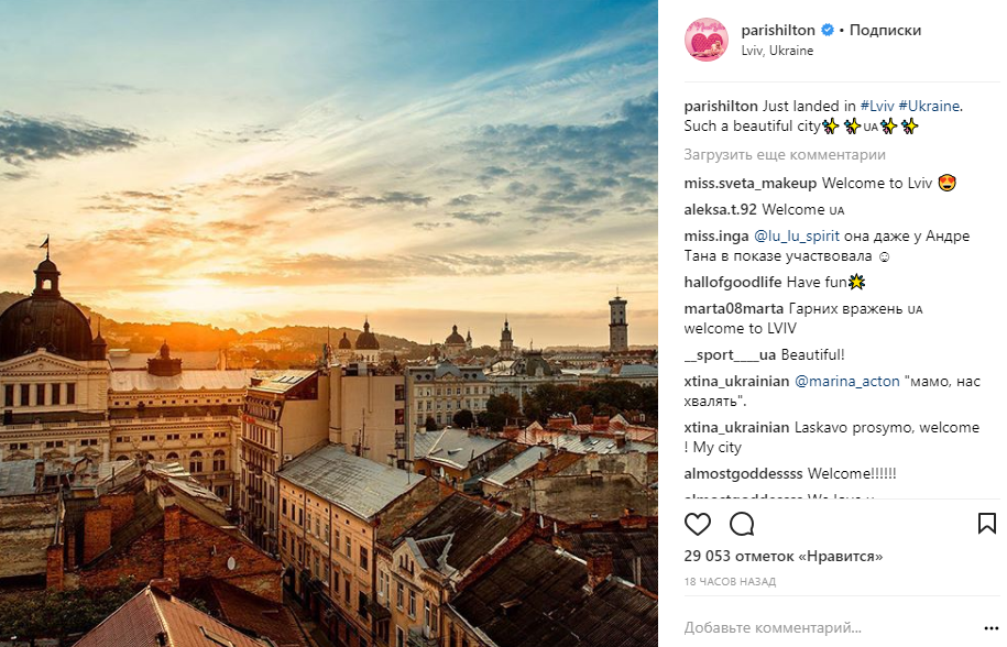 “Только приземлились во Львове, Украина. Такой прекрасный город”, – написала она.