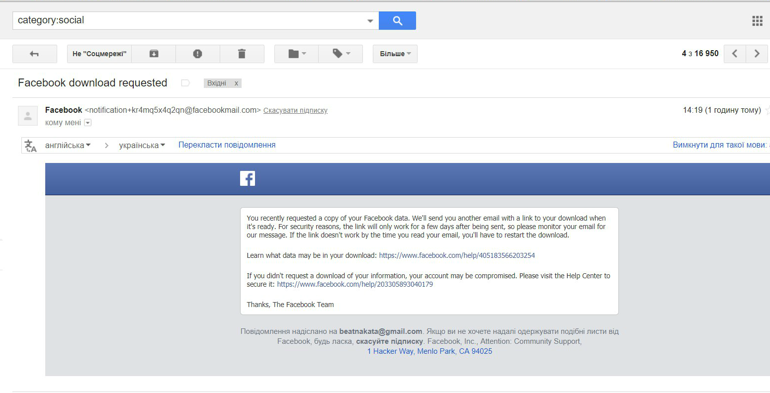 6. Facebook отправит ссылку на скачивание архива на почту, которую вы указали при регистрации аккаунта.