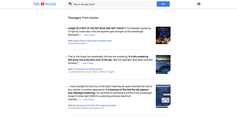 Первый проект называется Talk to Books и он позволяет общаться с алгоритмом, который отвечает на вопросы цитатами из написанных людьми текстов. При этом ответ выдается не на основе ключевых слов, а на основе контекста фразы.