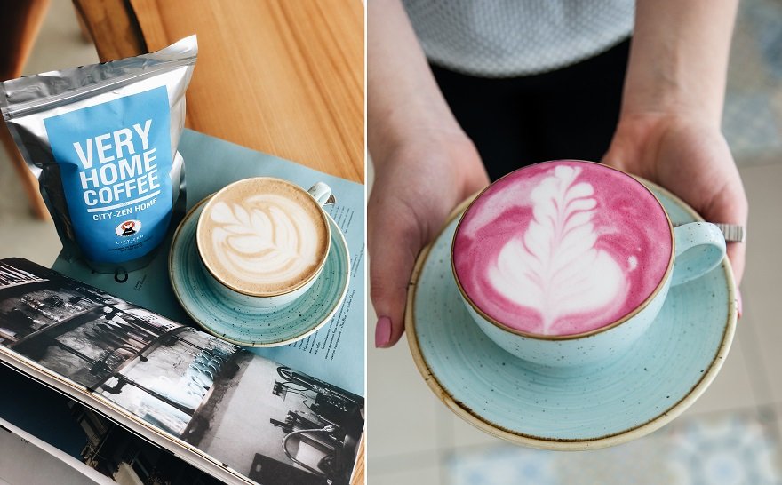 Звезда Instagram в новом City-Zen – цветной капучино (59 грн). Есть розовый, мятно-базиликовый, голубой и кокосово-угольный. Кроме того, место придется по душе всем любителям рафа: помимо классического (59 грн), здесь можно также попробовать кленовый раф, пряный банановый, шоколадно-имбирный, а также со вкусом попкорна или соленой карамели (все по 65 грн).