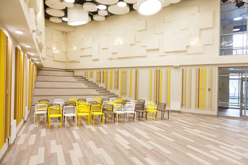 - Актовый зал, где, помимо концертов и утренников, проходят занятия по сценической речи, презентации школьных проектов.