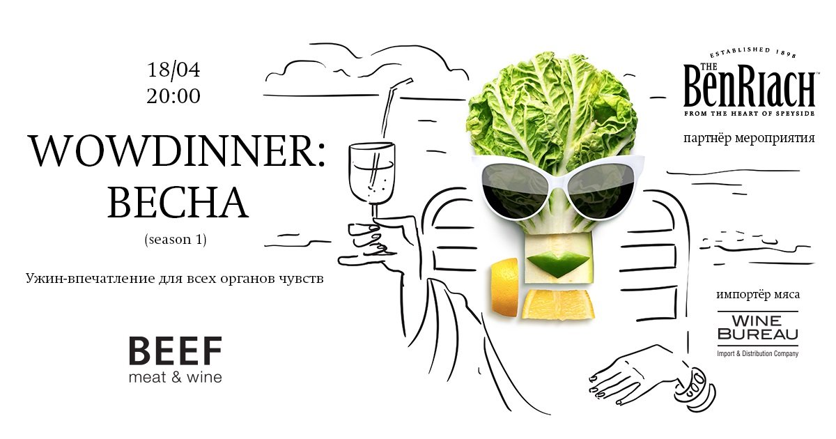 Первый из ужинов состоится в ресторане BEEF meat & wine. Совместно с WOWdinner BEEF meat & wine готовит целую серию ужинов под названием «4 сезона». Первый ужин «Весна» пройдет 18 апреля.