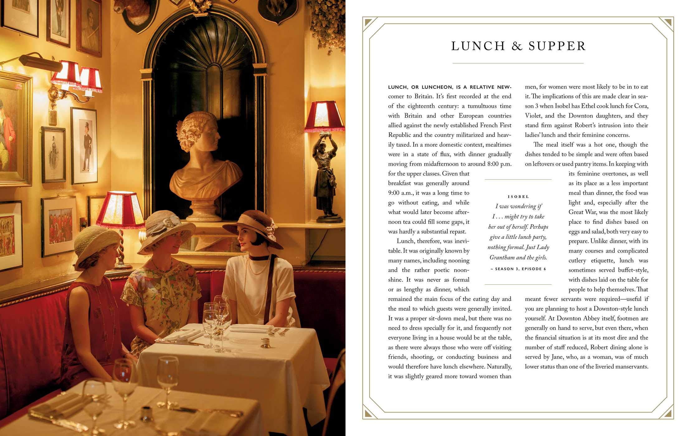 Зокрема, автор книги та історик їжі Енні Грей пропонує у книзі цікаву інформацію про страви, які були популярні між 1912 та 1926 роками, коли і відбувається дія в серіалі, у період величезних змін та конфліктів, а також ділиться кулінарними трендами й загальними правилами етикету початку ХХ століття.
