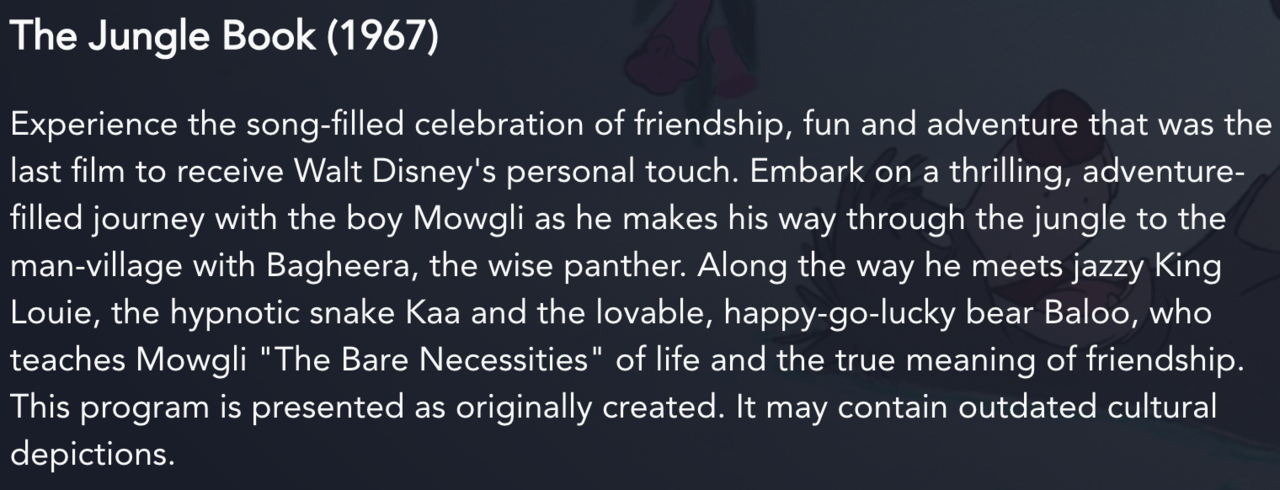 Такі дисклеймери з’являються, коли користувачі переглядають фільми, як-от «Дамбо», «Фантазія», «Леді і Бродяга» та «Книга джунглів» — всіх їх критикують за використання расових стереотипів.