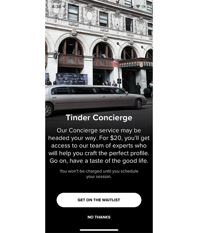 Сервіс онлайн-знайомств «Тіндер» анонсував запуск нової послуги – за $20 експерти компанії допоможуть користувачеві створити «ідеальний профіль». Послуга отримала назву «Tinder Concierge». У вівторок деякі користувачі почали отримувати сповіщення про нову послугу. Цікаво, що на reddit користувачі ділилися тим, що їм пропонували «прокачати» свій профіль за $50, а не за $20.