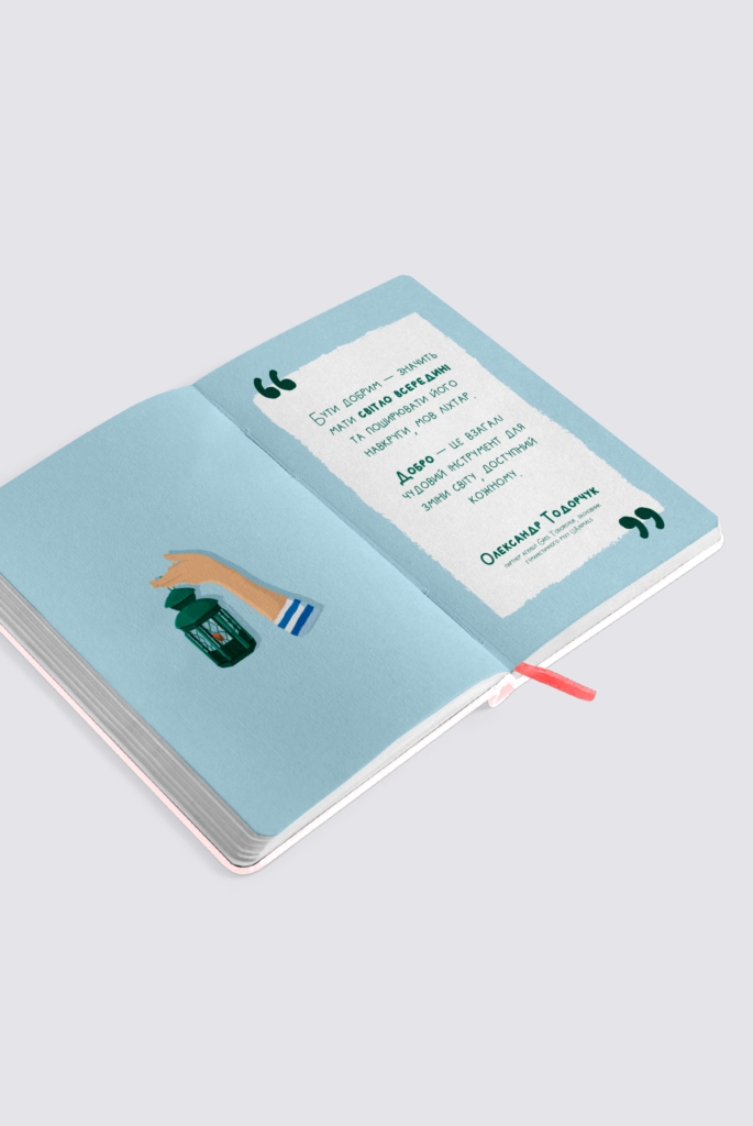 Це 160 сторінок із ілюстраціями, добірками фільмів, книг, виступів TED про добро. Крім того, в блокноті є 175 варіантів добрих справ на щодень і факти про їхню користь. Якщо у вас завжди було бажання зробити щось дійсно добре, та ви не знали, як саме – це ідеальний варіант.
