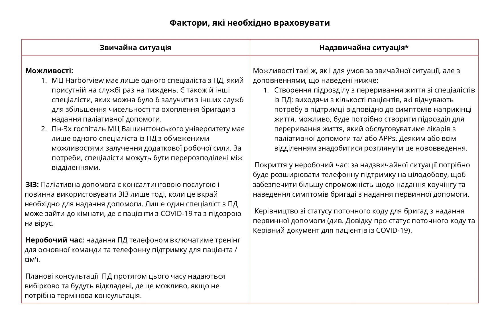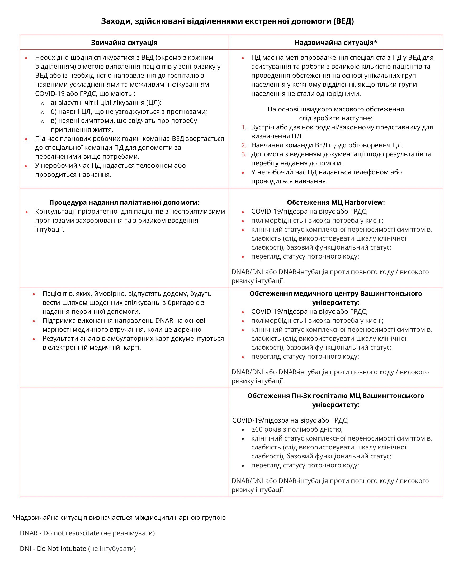 План, наведений нижче, призначений для регулювання надання паліативної допомоги (ПД) під час пандемії COVID-19 як за звичайних обставин, так і у разі погіршення ситуації. Виконання цього плану забезпечує систематичну оцінку потреб тяжкохворих пацієнтів з COVID-19 у паліативній терапії та її відповідність, показуючи високий процент захворюваності та смертності серед груп ризику.