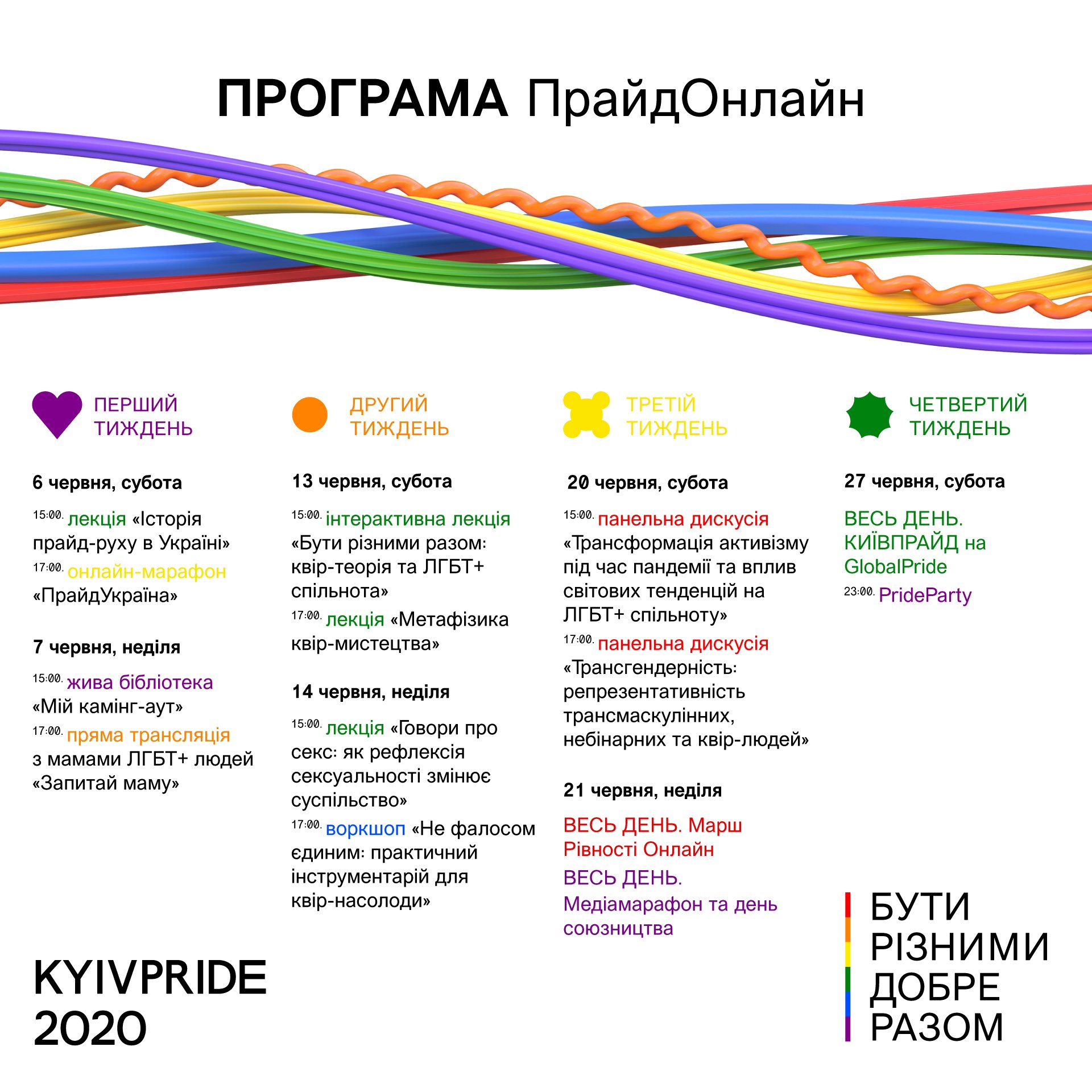Також у межах «ПрайдуОнлайн» з 6 по 27 червня щовихідних відбуватиметься низка онлайн-заходів, присвячених темі ЛГБТ+: панельні дискусії, флешмоби, розіграші, маратони, лекції, трансляції та вечірки. Усі заходи можна буде знайти в соцмережах та на інших діджиталплатформах.