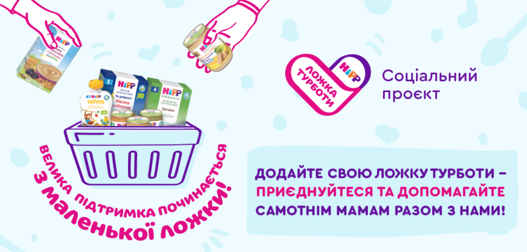В Україні є тисячі мам, які виховують малюків самостійно. Через пандемію та кризу дехто із цих жінок втратив можливість працювати: або нема на кого залишити дитину, коли закриті садочки, або відправили в неоплачувану відпустку. Ці мами не отримують фінансової допомоги, але дуже її потребують. Тому компанія HiPP Україна організувала благодійний проєкт «Ложка Турботи».