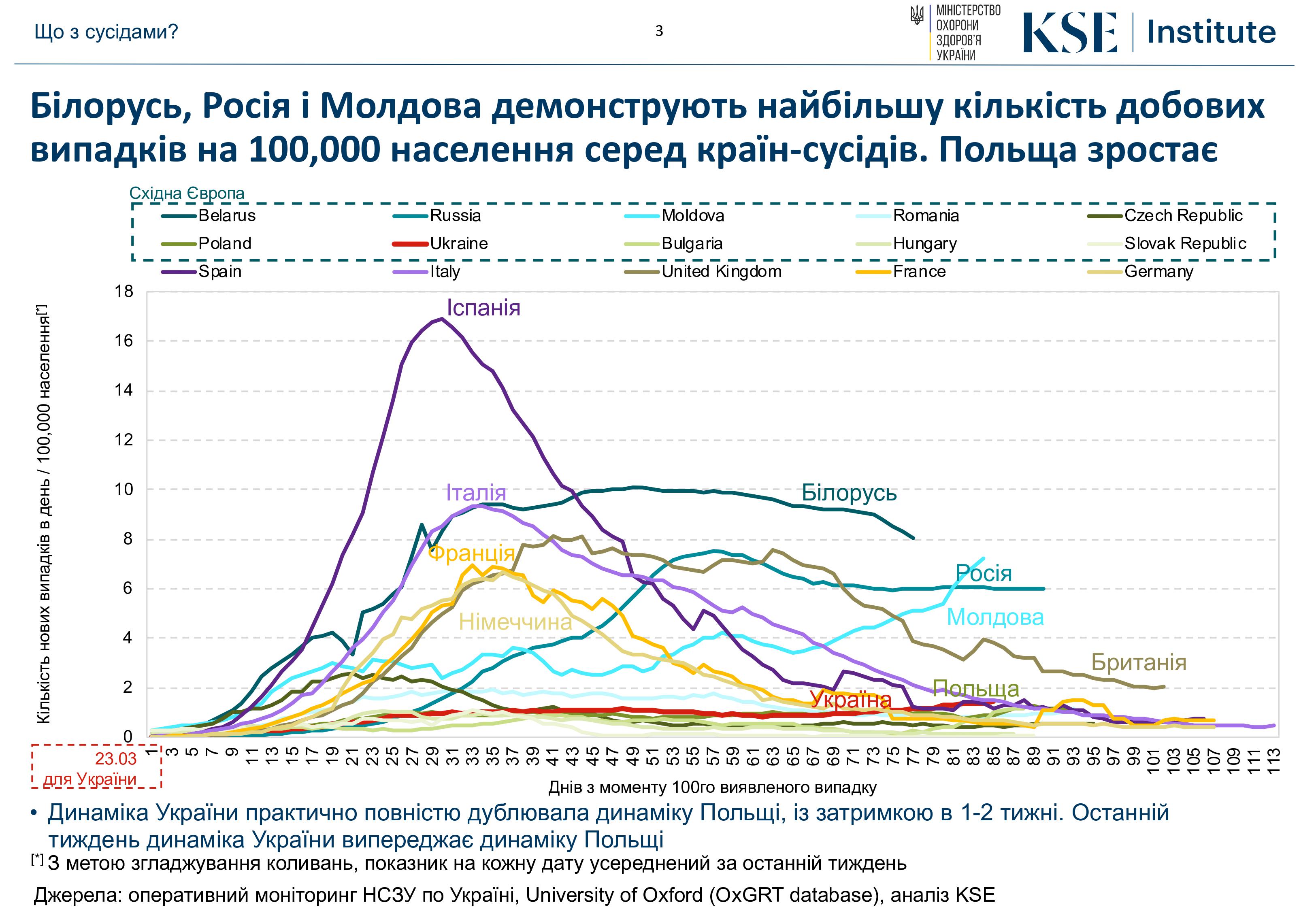 2. У Білорусі, Росії і Молдові найбільша кількість добових випадків на 100 000 населення серед країн-сусідів.