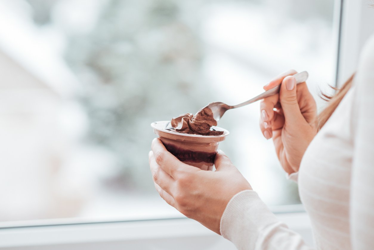 На середній швидкості збиваємо холодні вершки до слабкої густини, додаємо спочатку згущик, а потім – шоколад/какао-порошок і змішуємо на високій швидкості. Переливаємо суміш у контейнер і залишаємо в морозилці на 4-5 годин.