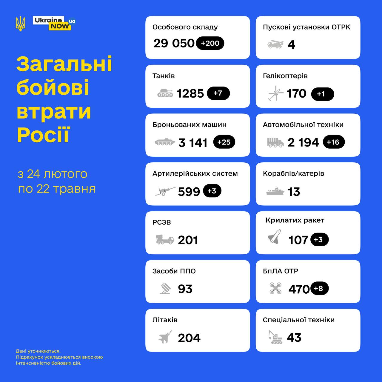 Загальні бойові втрати ворога з 24.02 по 22.05