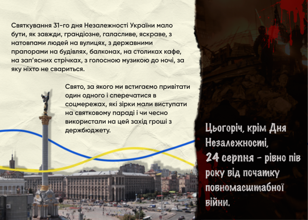 Цей День Незалежності припав на пів року з початку повномасштабної війни. І це свято зараз для нас напрочуд важливе.