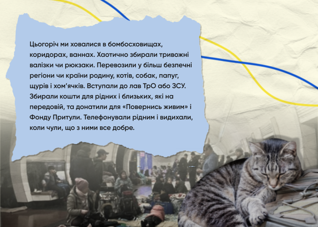 У 2022-му ми дізналися, що таке повномасштабна війна – вже не з розповідей родичів, які пережили її у середині минулого століття, а побачили на власні очі. Відчули, мабуть, найбільший в житті страх – коли прокидаєшся від звуків вибухів, коли біжиш до бомбосховища. Зрозуміли, що таке справжня ненависть – коли побачили фото з Бучі та відео з ТРЦ у Кременчуці, в який влучила російська ракета.