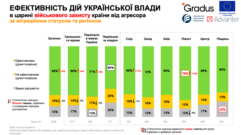 Оцінка дій влади в царині військового захисту країни від агресора теж покращилася (ефективними їх називають 69% проти 65% в кінці серпня).