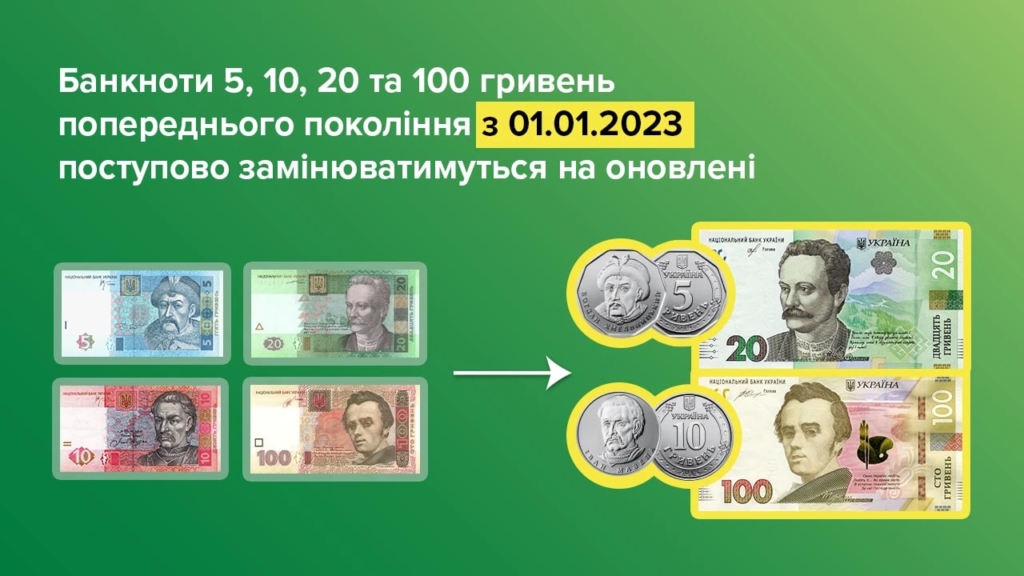 З 1 січня 2023 року Національний банк планує поступово вилучати з обігу застарілі паперові банкноти номіналами 5, 10, 20 та 100 гривень зразків 2003-2007 років і замінювати їх на оновлені.