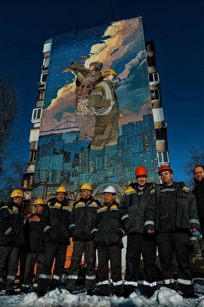 На муралі зображені воїн, який захищає українське небо, та енергетик, що оперативно ліквідує пошкодження електромереж.