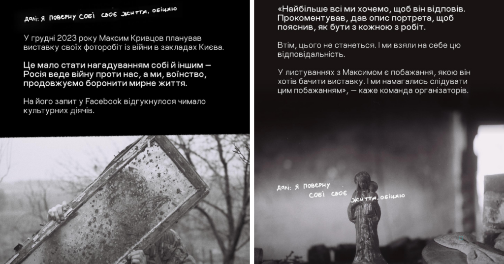 22 січня о 18:30 у Squat 17b відкриється виставка «Далі: Я поверну собі своє життя», присвячена пам’яті поета й військового Максима Кривцова. Виставка складатиметься з 24 фоторобіт Максима і буде доповнена його поезіями.