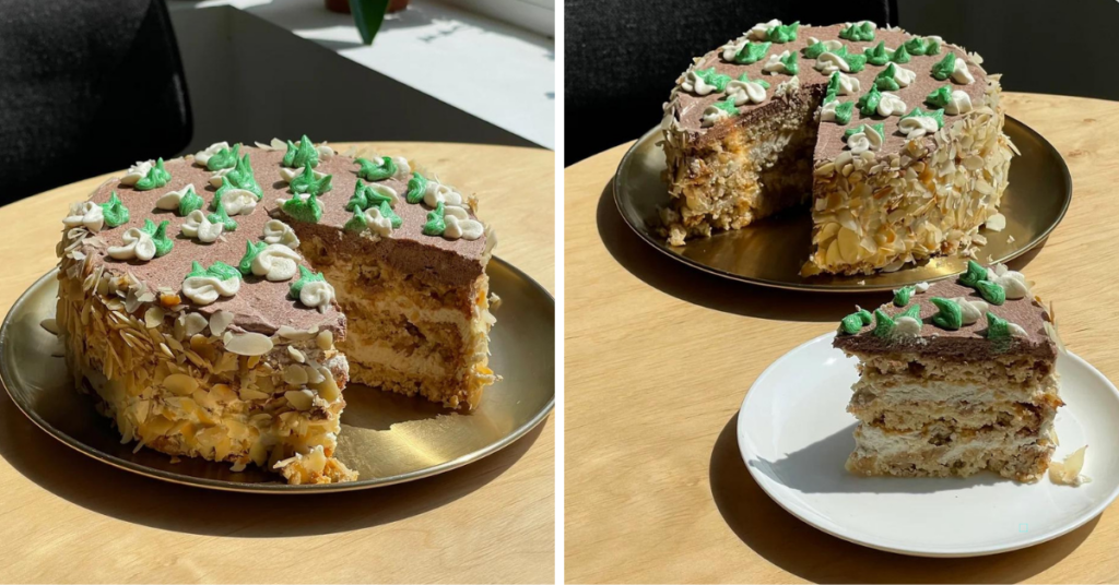 Це веганська версія легендарного Київського торта. У десерті немає яєць, лактози і борошна, він готується з додаванням коричневого цукру.