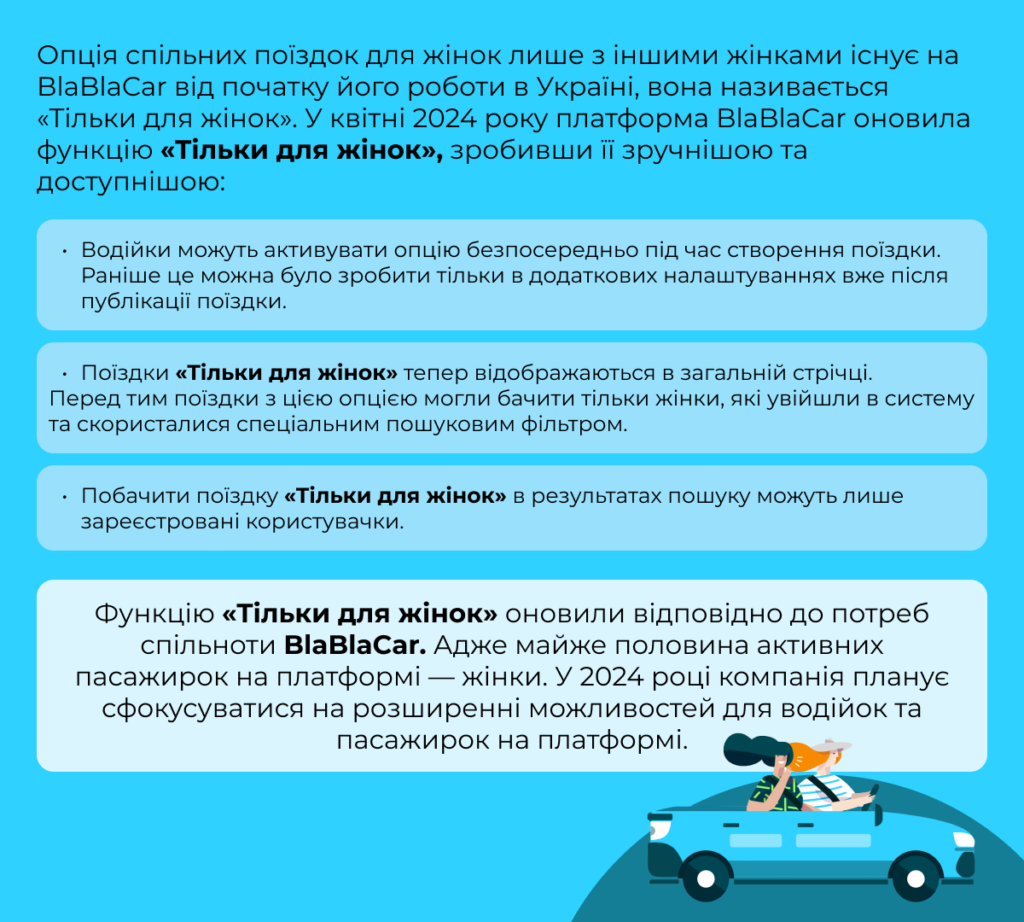 У сучасному світі разом з потребами суспільства розвивається й бізнес. Однією з найважливіших тенденцій є інклюзивність, яка охоплює всі сфери життя і є особливо актуальною для України. BlaBlaCar в Україні активно користуються 2 мільйони користувачів, з яких 55 тисяч — водійки. Ці жінки від 18 до 83 років (саме таким є вік найстаршої водійки на BlaBlaCar) об’єднують навколо себе людей, розширюють свої можливості та просто люблять кермувати.