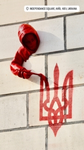 Робота на будівлі «Головпоштампу» – це скульптура дитини у червоному кольорі, який виходить зі стіни будівлі та малює на фасаді тризуб.