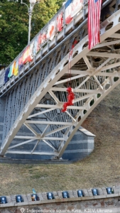 На останній роботі дівчинка у касці сидить на гойдалці, яка звисає з мосту над Алеєю Героїв Небесної Сотні.