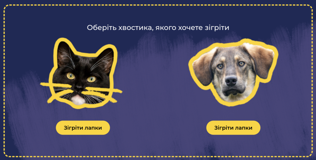 Масштабувати проєкт вдалося завдяки креативному залученню аудиторії: наприклад, амбасадорами благодійних кампаній ставали тварини з притулків. Обличчями проєкту «Тепло хвостикам» стали кішка Адалія та пес Тетріс: на сайті їх можна було погладити, зігріти їм лапи – і долучитися до збору коштів через ігровий процес.