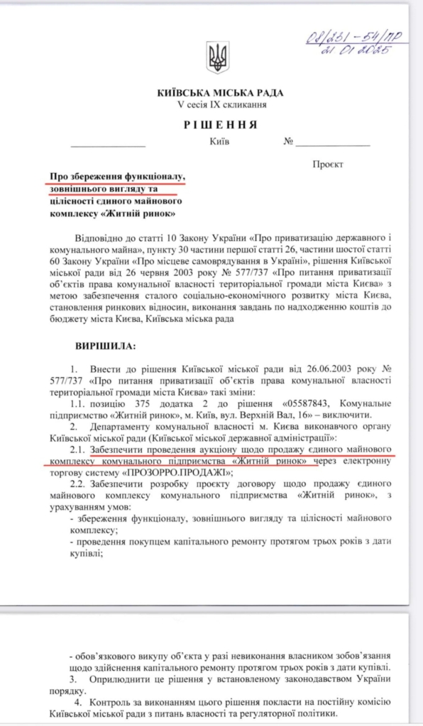У Київраді зареєстрували проєкт рішення щодо продажу Житнього ринку