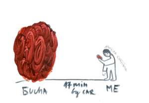 Робота охоплює події від 2014 року, коли художниця спілкувалася з мамою, що залишалася в окупованій Жданівці на Донеччині, і до 2025-го, коли війна все ще триває.